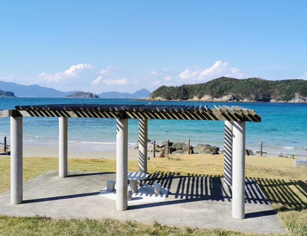 「日本一美しい」と称される、コバルトブルーの高い透明度を誇る海と白い砂浜が続く遠浅の海岸です。「日本の渚100選」に選ばれた高浜海水浴場にも匹敵する、どこまでも青く清らかな海が広がります。その美しさは訪れる人の心を洗うような感動的な景色として知られ、蛤(はまぐり)のような美しい貝殻が砂浜に落ちていることもある、自然豊かな場所です。