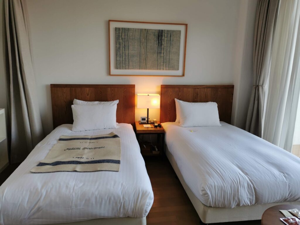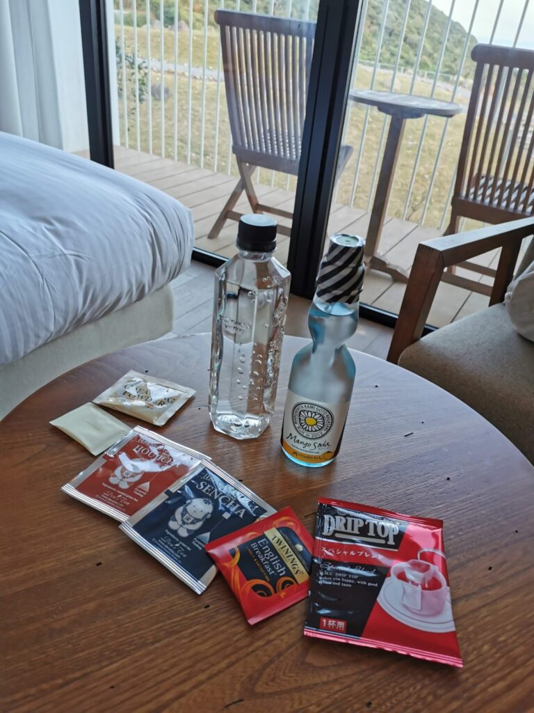 また、部屋には湯沸かしポットとカップ、ティーバッグのサービスがあり、夜に海を眺めながらお茶を飲む時間も楽しめました。冷蔵庫にはペットボトルのミネラルウォーターも用意されています。