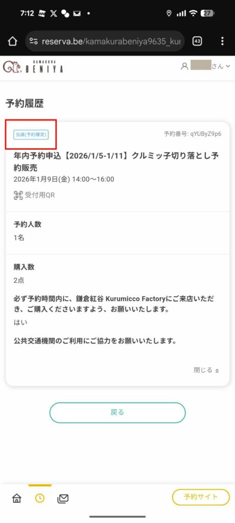 抽選に当選すると、マイページとメールで当選通知がきて、QRコードが発行されます。