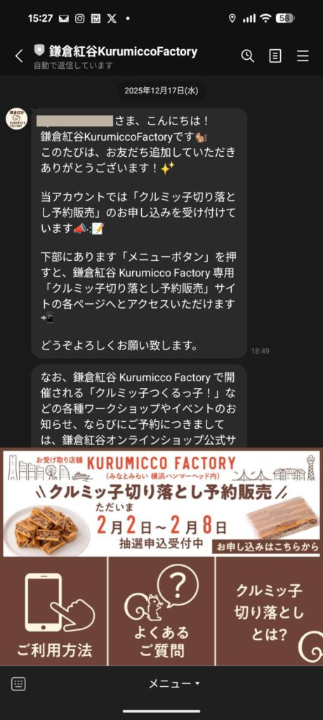 LINE上で「クルミッ子切り落とし」購入抽選の案内が届きます。