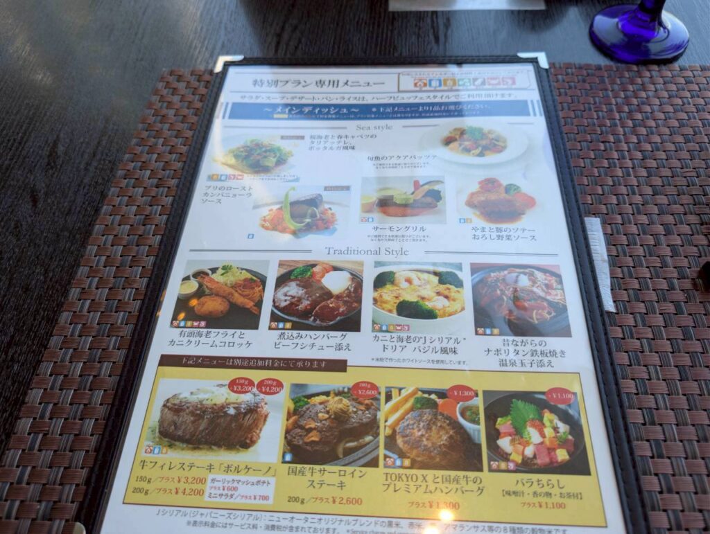 席に着くとメニューが渡させメイン料理を選ぶように言われます。その他にも、簡単にビュッフェやフリーフロー(飲み放題)の説明がありました。