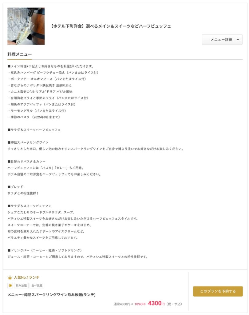 5000円以下で自分へのご褒美にぴったり!スパークリング飲み放題付きランチビュッフェ体験【ニューオータニイン横浜プレミアム】