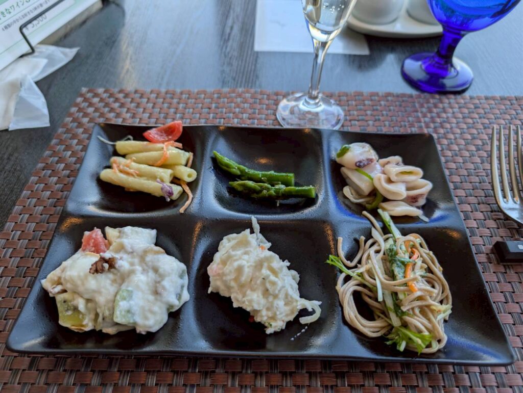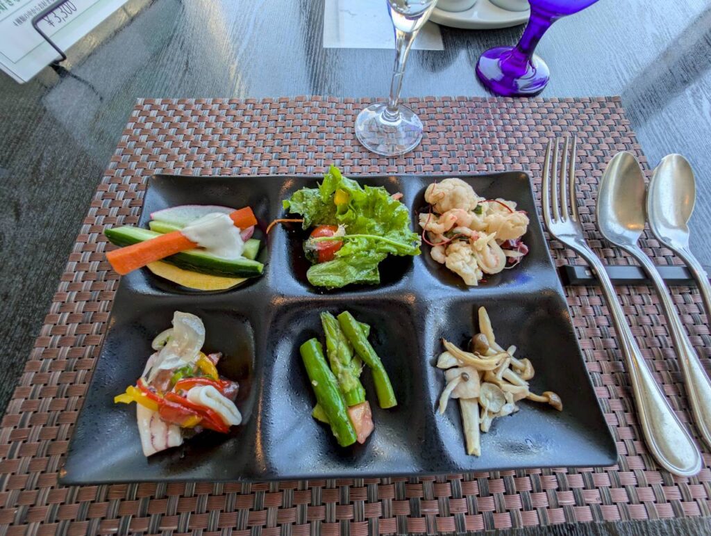 ビュッフェは魚介や野菜中心の前菜が多く、全体的にヘルシーな印象。女性には嬉しい内容で、罪悪感なく楽しめる構成です。
