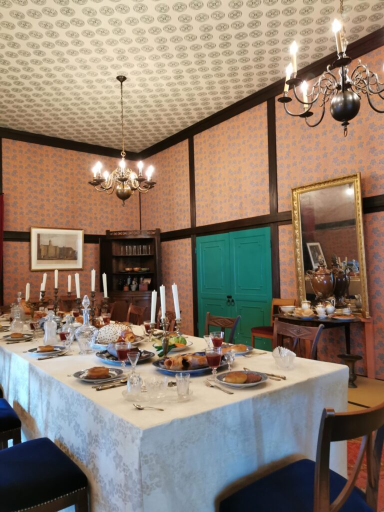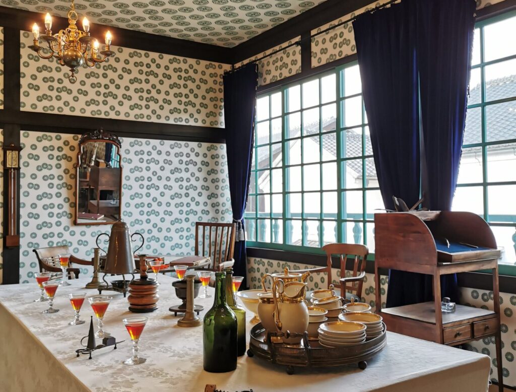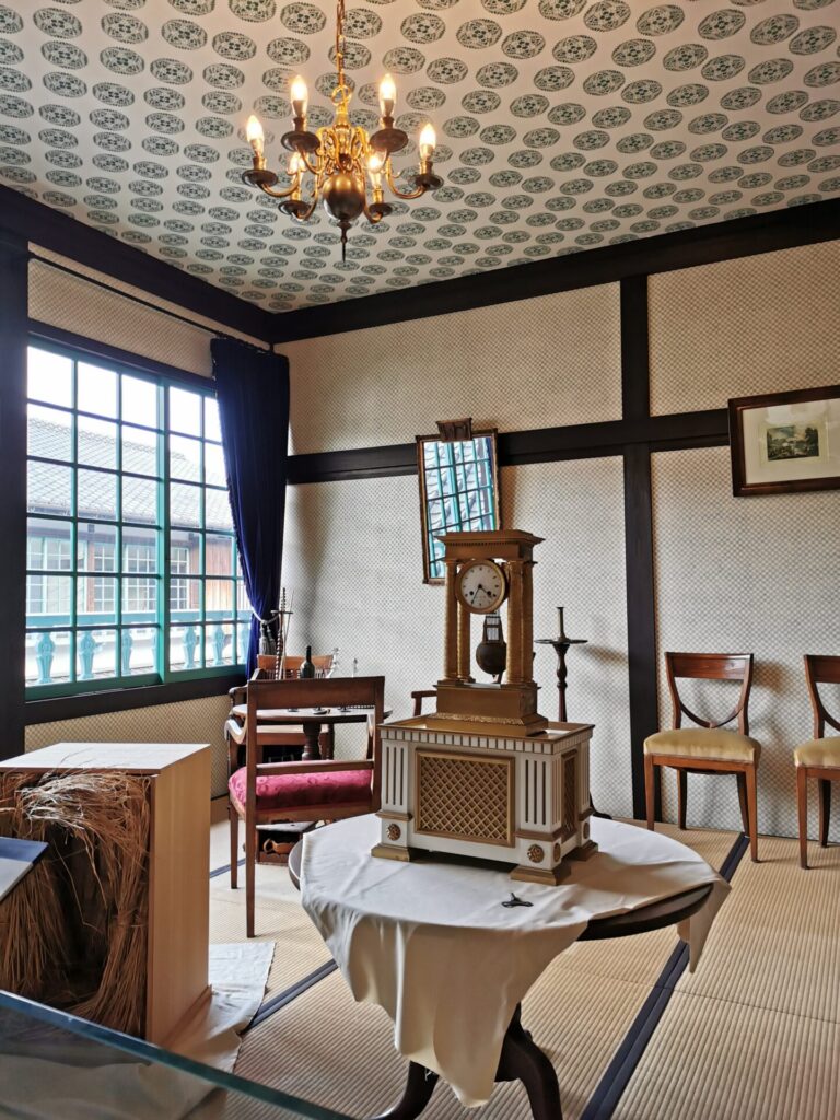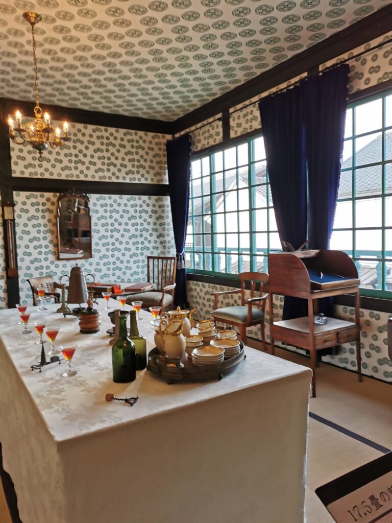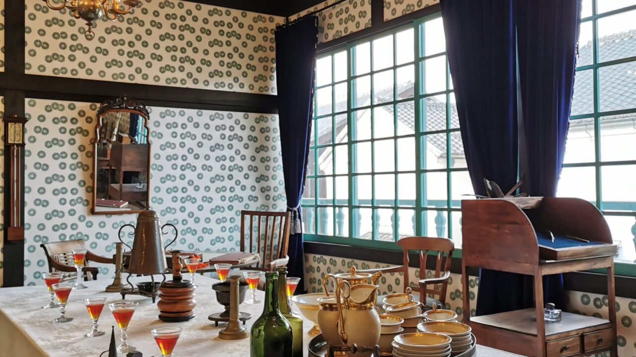 女性の一人旅で出島がおすすめだと感じた理由は、展示されている空間そのものがとても可愛く、見ていて飽きなかったこと!当時の人が実際に使っていた食器や家具が置かれていて、日本の古民家のような落ち着いた間取りの中に、カラフルな壁紙や豪華な食器が並ぶ様子はどこかアンバランスでレトロ。でもめちゃくちゃ可愛い!!